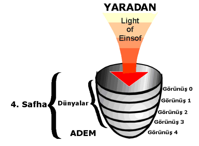 1) Işığını kısıtlayabildiği dereceye kadar kısıtlamak, Tsimtsum (kısıtlama) arkasına Tsimtsum. Bu şekilde yukarıdan aşağıya seviyeler oluşturulmaktadır, “Eyn sof” (sonsuz) seviyesinden ki bu Yaradan’a yakın yerdir, aşağıya doğru “bu dünyanın” seviyesine, yaratandan en uzak noktaya. Bu oluşuma dünyalıların ve Partsufim’in açılımı denir.
